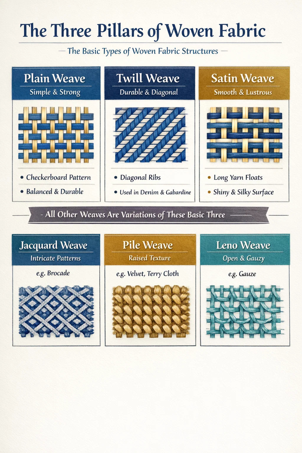Iako postoje stotine specifičnih tržišnih naziva za tekstil, tehnički postoje tri osnovne vrste tkanina strukture iz kojih su gotovo sve ostale izvedene: Obično tkanje, keper tkanje i satensko tkanje . Svaka druga varijacija, poput Jacquard, Dobby ili Hrpa tkanja, složena je modifikacija ova tri osnovna uzorka isprepletanja. Razumijevanje ovih kategorija bitno je za prepoznavanje trajnosti, zastora i korisnosti bilo kojeg tekstilnog proizvoda.
