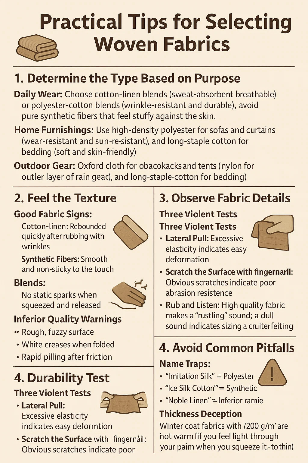 Dnevna odjeća: Odaberite mješavine pamuka i lana (upijaju znoj i propuštaju zrak) ili mješavine poliestera i pamuka (otporne na bore i izdržljive), izbjegavajući čista sintetička vlakna koja su zagušljiva na koži.