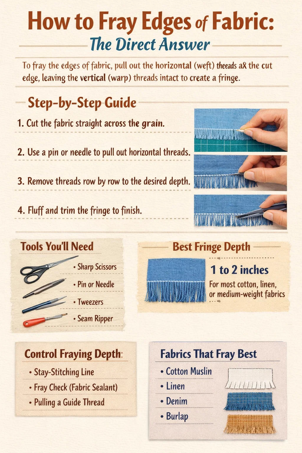 Da biste pohabali rubove tkanine, izvlačite vodoravne niti (potke) duž odrezanog ruba tkanine, ostavljajući okomite niti (osnove) netaknute i labave. To stvara karakterističan izgled rubova ili izlizanog izgleda. Najpouzdanija metoda je napraviti ravni rez, a zatim iglom ili iglom olabaviti i izvlačiti niti jednu po jednu s ruba, radeći red po red dok ne postignete željenu dubinu resica. Za većinu tkanih tkanina srednje težine poput pamuka ili lana, izvlačeći niti na dubinu od 1 do 2 inča stvara punu, privlačnu resicu bez ugrožavanja strukturalnog integriteta komada.