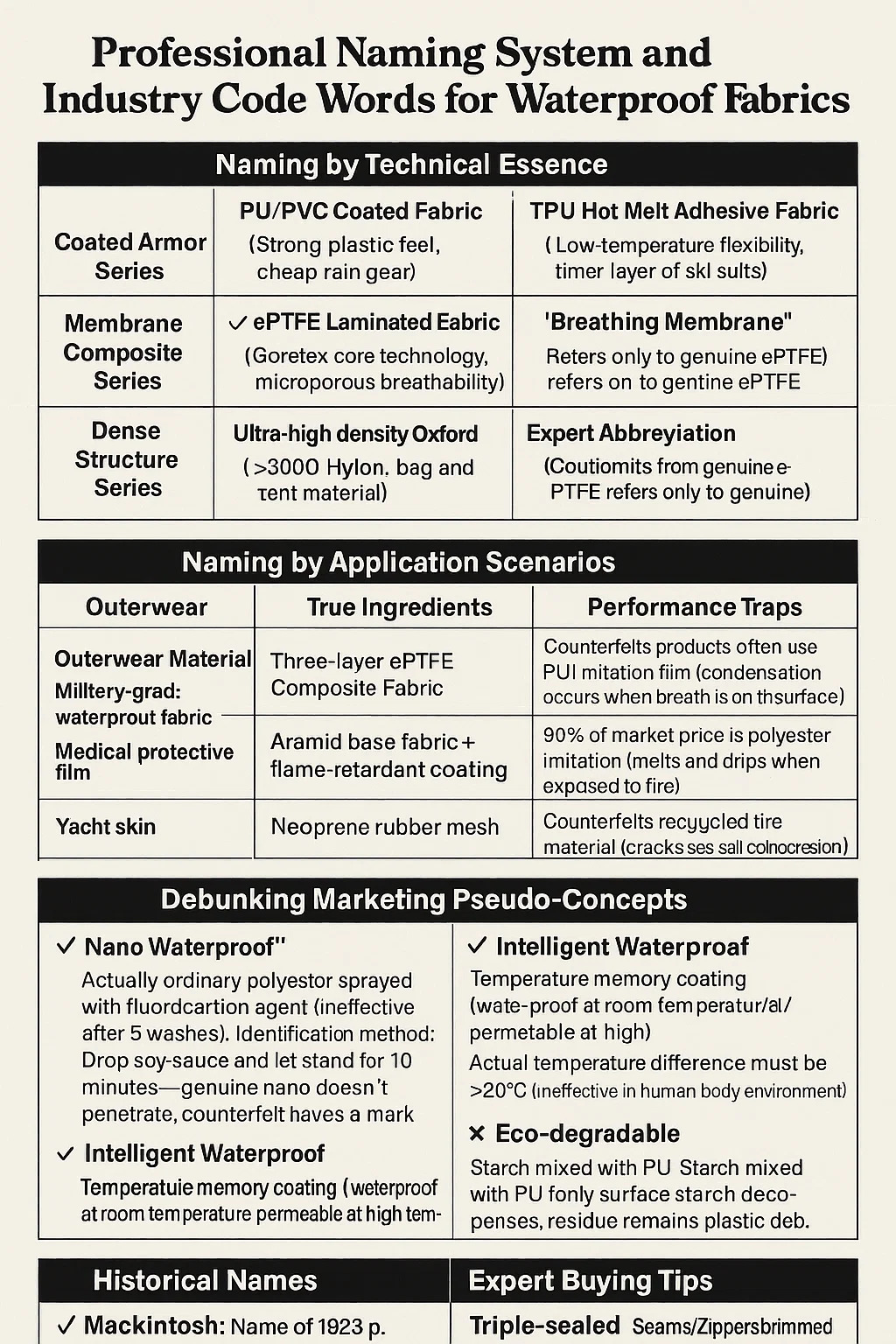 "Nano vodootporan": zapravo obični poliester poprskan fluorokarbonskim sredstvom (neučinkovit nakon 5 pranja). Metoda identifikacije: Ispustite sojin umak. Metoda identifikacije: Kapnite sojin umak i ostavite stajati 10 minuta—pravi nano ne prodire, krivotvoreni ostavlja trag.