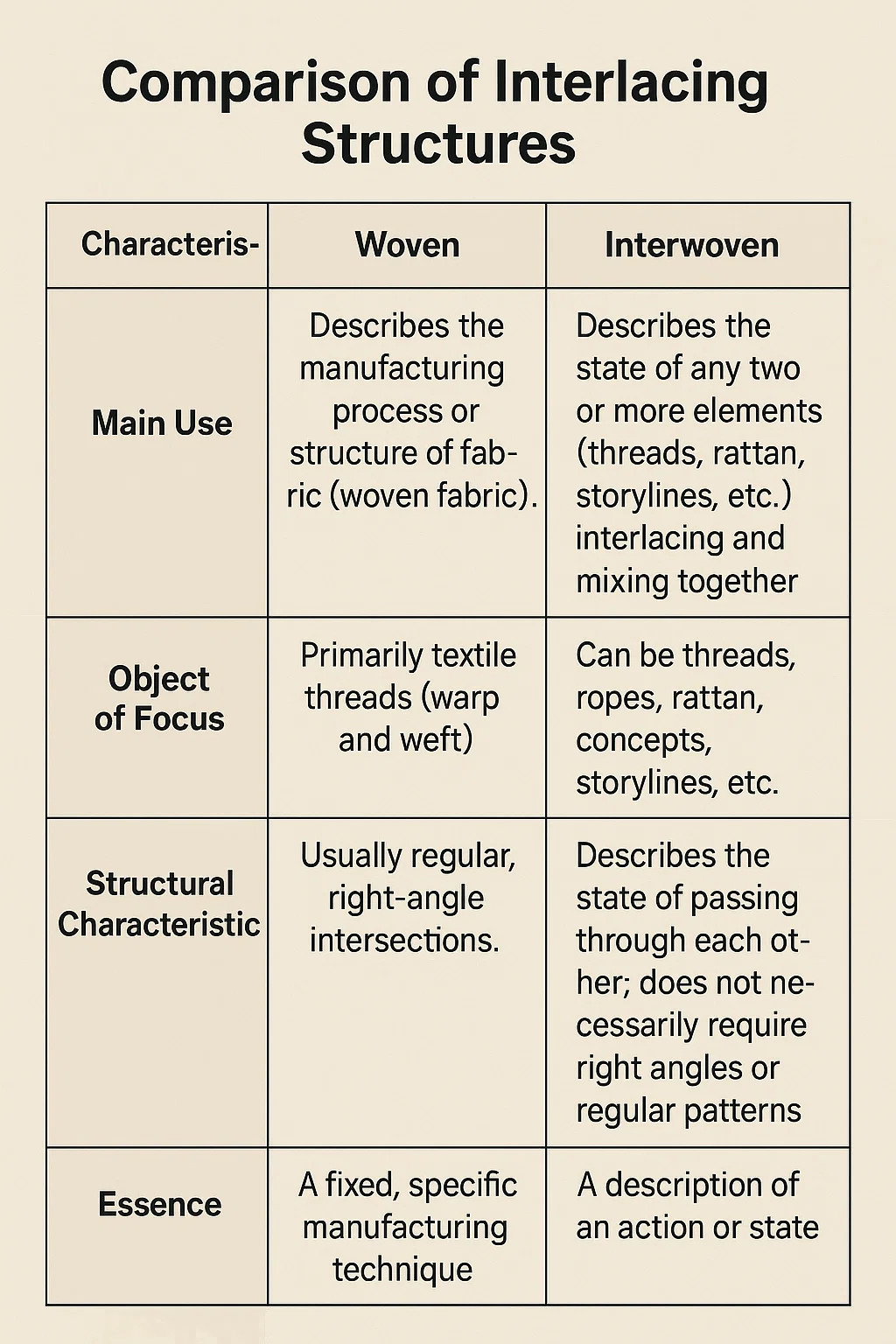 Riječi "tkani" i "isprepleteni" vrlo su slične u značenju, ali imaju suptilne razlike kada opisuju kako su niti ili vlakna povezana.